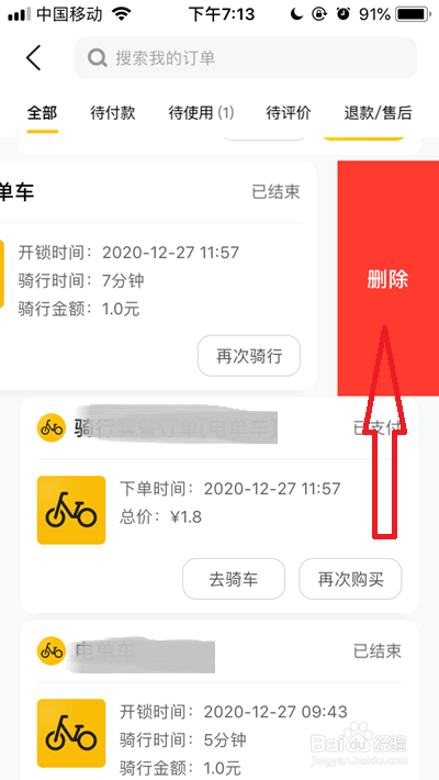找到本身需要删除的订单后,用手指标的目的左滑动,就会显示删除字样。我们点击订单右侧显示的【删除】