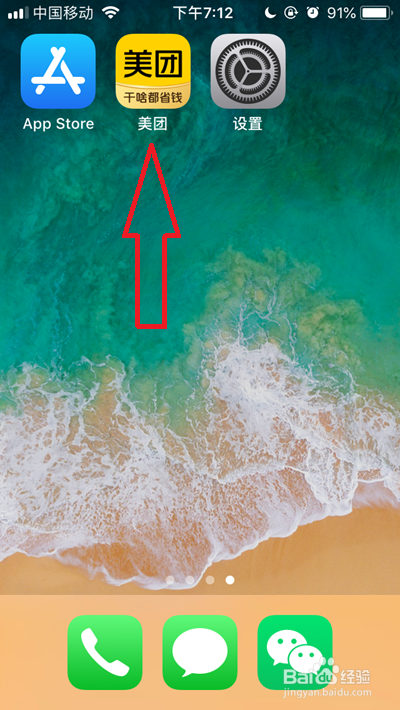 我们先点击苹果手机桌面上的美团app图标。(每一步已截图,请连系我的截图来操作)