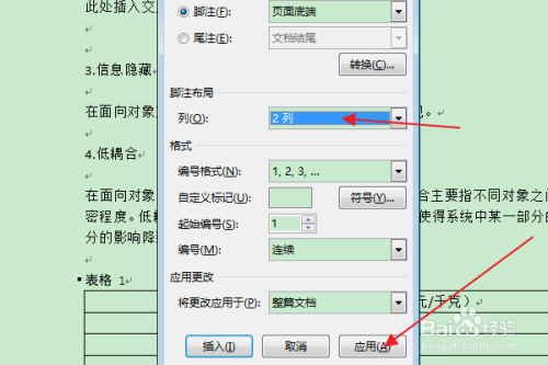 在弹出的“脚注和从头至尾注”对话框中,在脚注结构栏中点窜“列”右侧下拉框为“两列”,点击“应用”按钮。