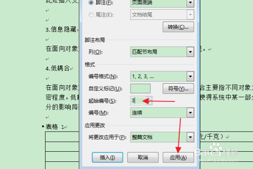 在弹出的“脚注和从头至尾注”对话框中,点窜“格局”栏中的“肇端编号”框数值(好比:3),点击“应用”。