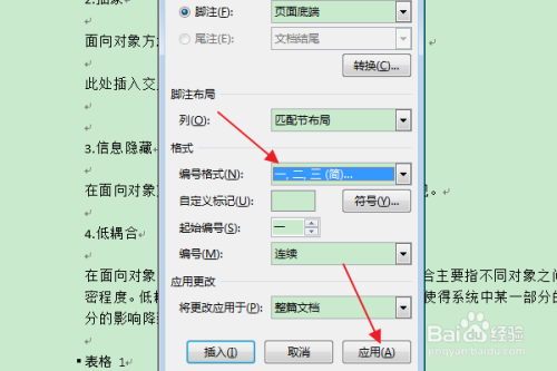 在弹出的“脚注和从头至尾注”对话框中,点窜格局栏中的“编号格局”,点击“应用”。