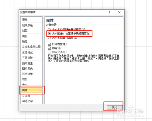 点击属性,点击大小固定,位置跟从单位格而变前面的小圆点。