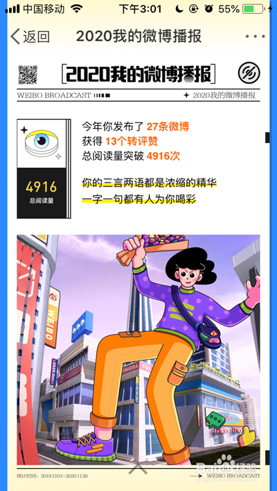 然后用手指上下滑动,就可以查看到本身的2020微博播报啦!