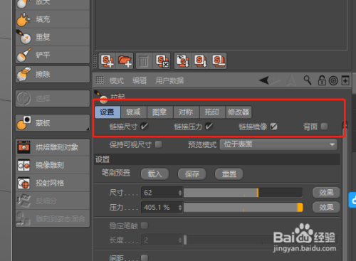 属性中的“链接尺寸”、“链接压力”、“链接镜像”选项的意思则是若是勾选之后,那么在选择其他雕镂东西之后其尺寸、压力、镜像的参数都将连结不变,都是同一的数值。