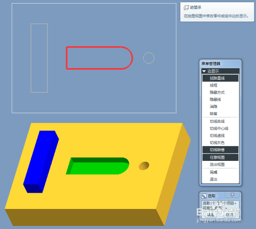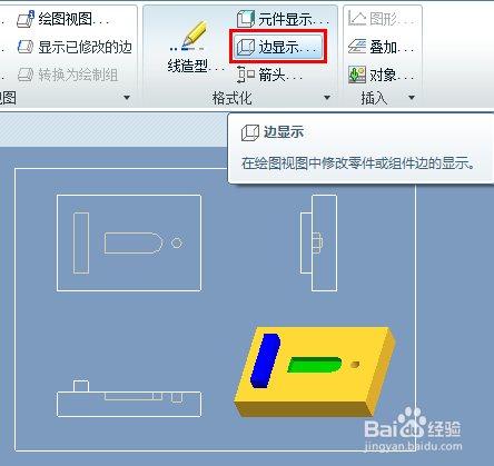 这里我们就需要利用工程图中的“边显示”指令了,指令位置:格局化功能区中的“边显示...”图标。