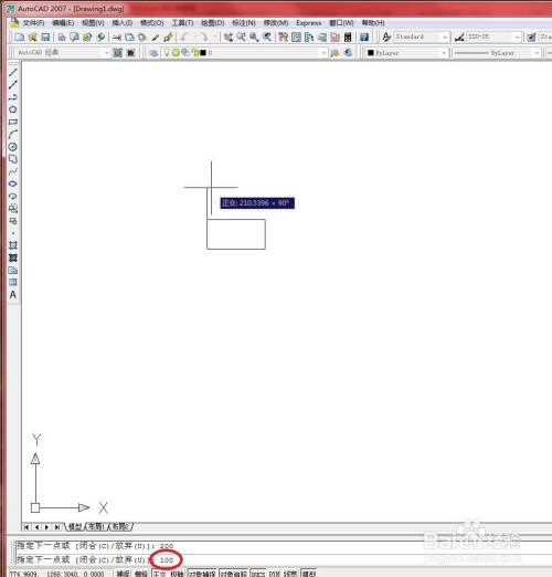 垂直标的目的上拖动鼠标指定直线偏向,在号令行输入直线长度,并按【Enter】键确认。如下图所示。
