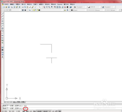 垂直标的目的下拖动鼠标指定直线偏向,在号令行输入直线长度,并按【Enter】键确认。如下图所示。