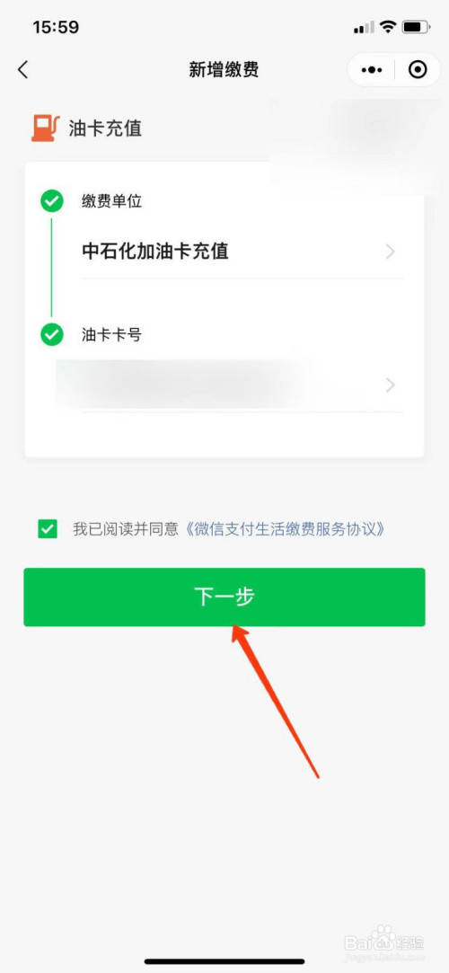 最后输入油卡卡号,点击下一步即可起头缴费