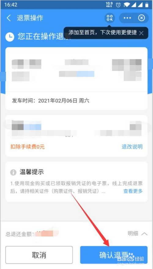 第6步确认退票信息后,直接点击确认退票。
