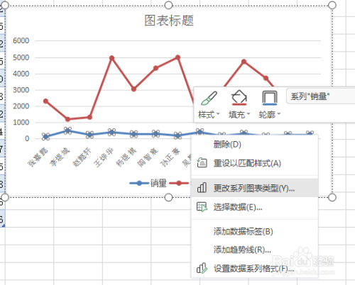 我们选中下边这条蓝色线条,右键点击,选择“更改系列图表类型”。