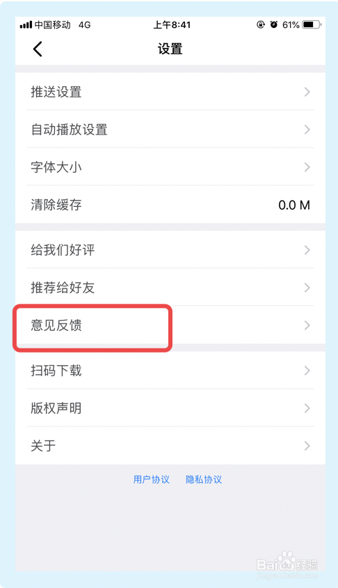 在接下来的界面,点击【定见反馈】选项。