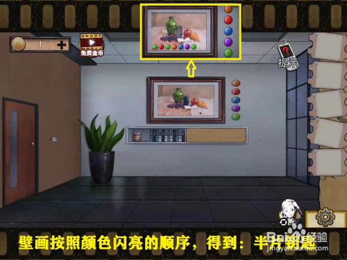 男本家儿进入的房间,这边有个壁画,需要点亮颜色,按照颜色闪亮的挨次完当作即可,获得:半片钥匙;在壁柜何处获得:手柄。