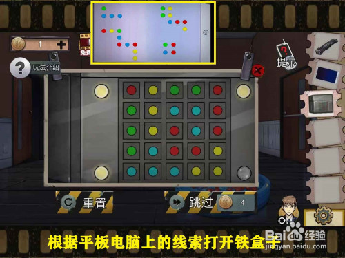 中式钥匙打开第一间房的壁柜,获得铁盒子,这里面有个颜色拼图游戏,需要用到平板电脑上的啄木鸟敲钟的过关后的线索,点亮铁盒子四个角的灯,最后获得:润滑油。