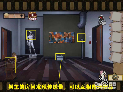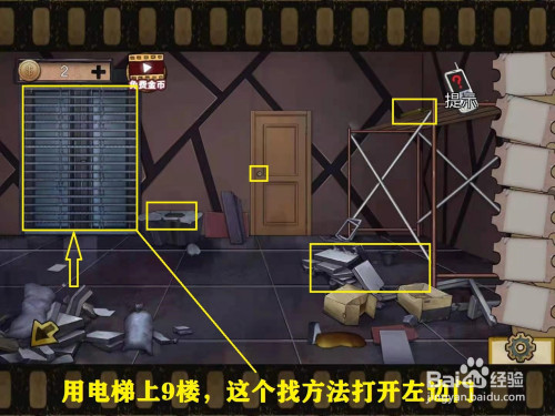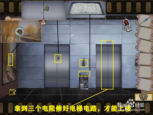 在垃圾桶和右边壁画上别离找到电阻、六角扳手,修好电梯,上楼。