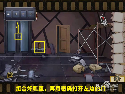 把桶装水和水泥、残破的雕塑等组合,获得完整的雕塑,打开左边卷闸门,用电梯里面获得的线索:4926打开门。