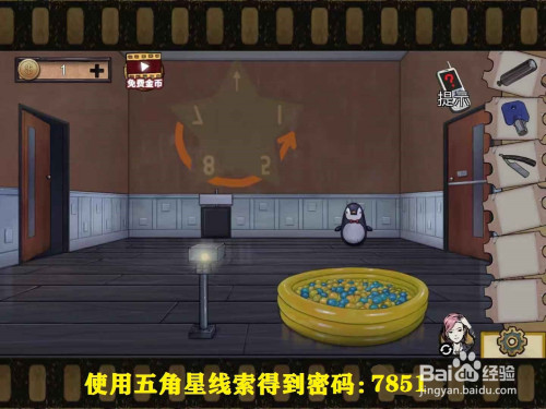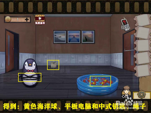 男本家儿进入下个房间,这里有企鹅、水龙头、投影仪。在黄色球里面获得:红色海洋球,在自来水这里获得:剃刀;在企鹅嘴巴里获得:纸条——投影仪线索。