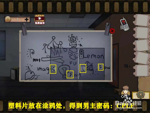 把塑料卡片放在女本家儿房间墙面上的涂鸦处,可以获得男本家儿何处的玻璃门的密码:CPLF,进入里面房间。
