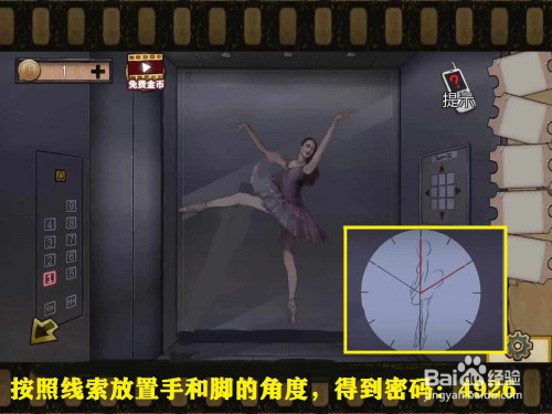 打开电梯,里面有张舞者的画,按照接到台上画着时钟的立牌上的提醒,获得数字密码:4926.
