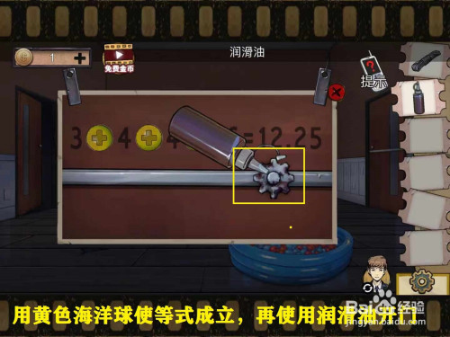 女本家儿利用黄色海洋球的乘号、加号、除号使门上的等式当作立,再利用润滑油松齿轮,开门进入下个房间。