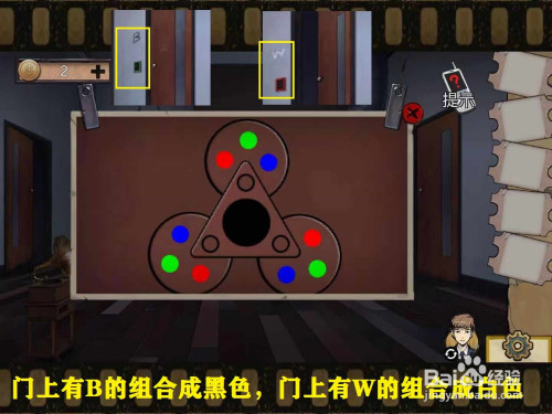 别离用密码开启颜色组合机关,在门上有B(black)字母的,组合当作黑色——所有颜色均不选;门上有W(white)字母的,组合当作白色——红黄蓝三色,打开门,与小丑碰头。