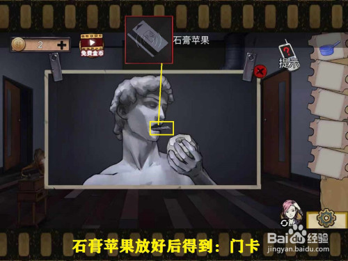 放在留声机上播放,获得绿色密码:4806;再取下来,给女本家儿播放,获得红色密码:5492,再用剃刀打开蓝色海洋球,获得:石膏苹果,放在雕塑手上,获得:门卡。