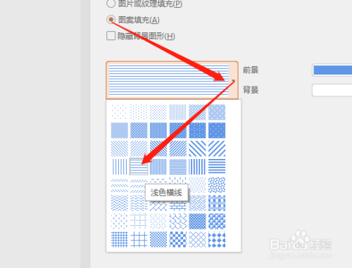 2.在图案填充中,点击下侧预设图案,并选择“淡色横线”选项即可。