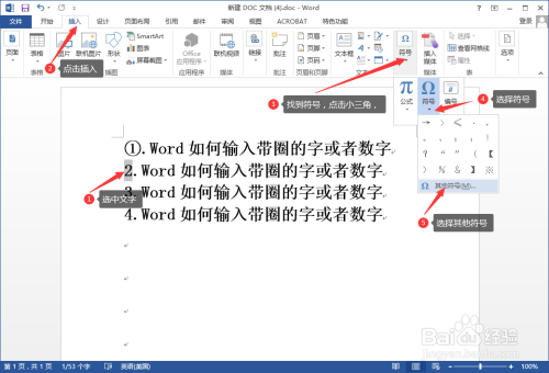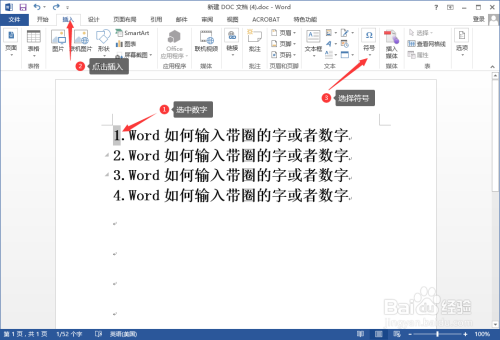 打开我们需要加圈的Word文档,选中数字,在菜单栏点击插入,找到符号。