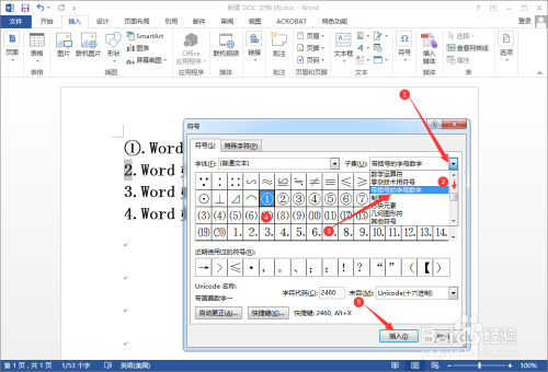 点击 “其它符号”后,打开“符号”对话框,在右上角“子集”的列表中选择“带括号的字母数字”,在“符号”对话框的呈现关于各类带圆圈的数字,双击插入到Word文档中。
