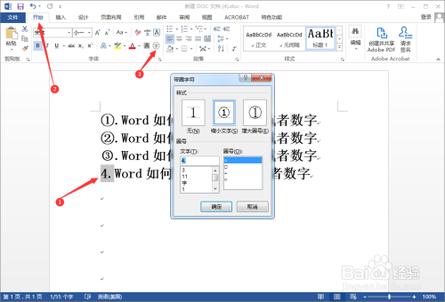 选中需要带圈的数字或者字,点击菜单栏中的“起头”,在弹出的东西列表中选择“带圈的字”东西,如下图所示: