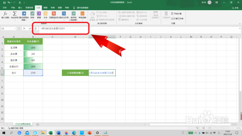 第三步,接着输入公式,用消费总金额除以家庭生齿数。