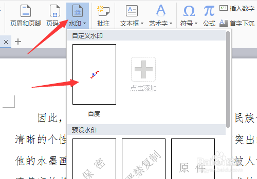 这时,我们再次点击【水印】,在自界说水印中点击本身才设置的图片水印。