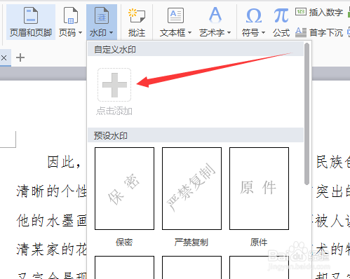 点击【水印】后在弹出的窗口中,我们在自界说水印处点击【点击添加】