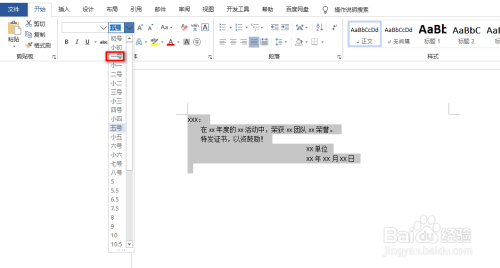 选中上述输入的文字,并设置字体为“一号”,具体如图所示: