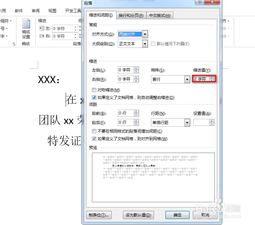 选中一个段落,并鼠标右键,点击“段落”,在弹出的对话框中,设置缩进为2字符,具体如图所示: