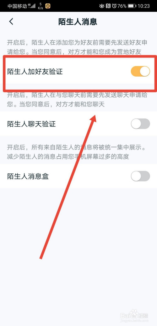 接着在找到“目生人加老友验证”功能,我们可以看到,该功能开启后,目生人添加老友时,需要发送验证动静;