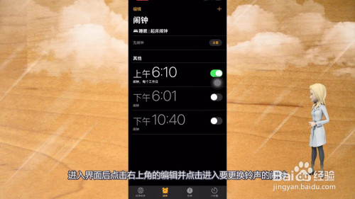 2、进入界面后点击左上角的编纂并点击进入要改换铃声的闹钟。