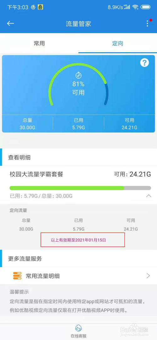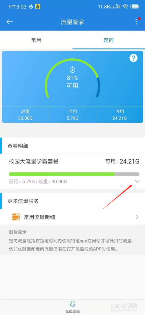 该页面中就能查看定标的目的流量的明细了,点击套餐下面的小箭头可以更多明细。