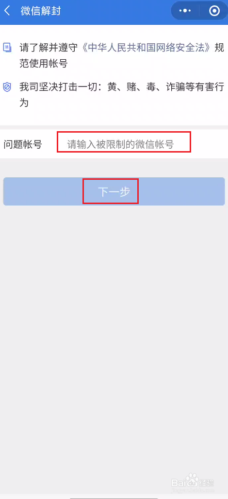 这里我们需要输入微信账号,再点击一步,就可以进行解封。