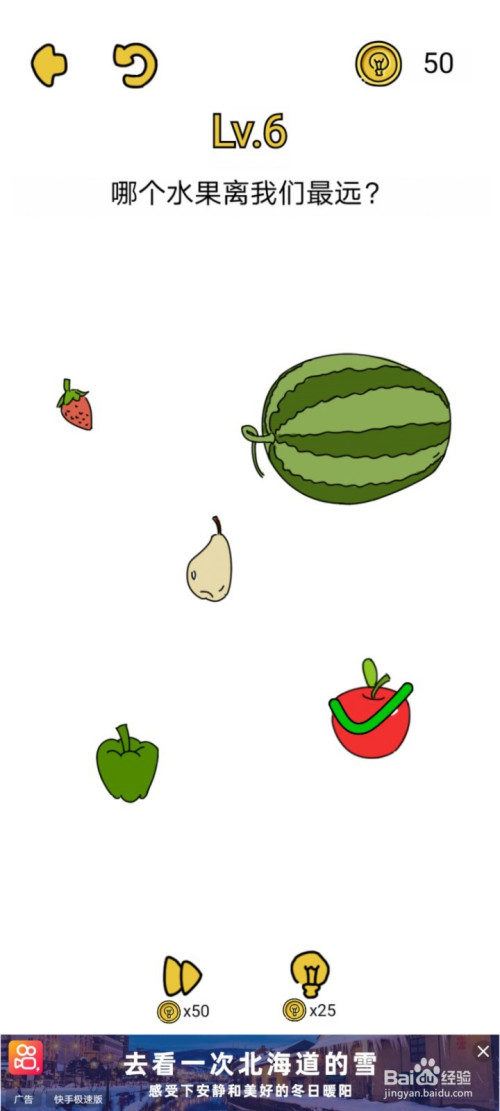 因为屏幕之中苹果离标题问题中的“我们”最远的生果,所以点击苹果