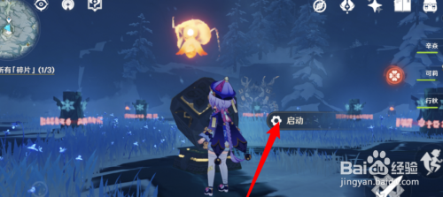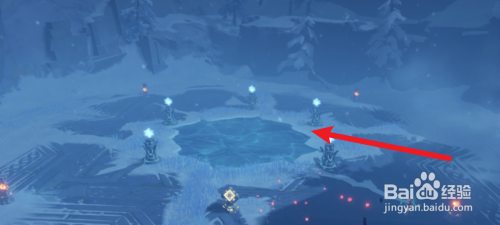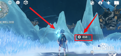 4、然后我们去到圆盘下面,用用深赤之石打坏冰树,点击启动,这样我们就能解锁雪葬之都近郊碎片。