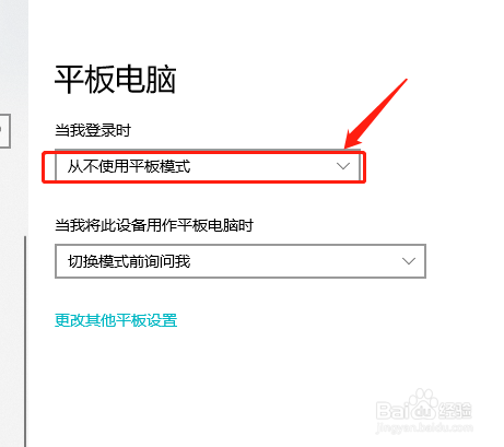 最后,在“当我登录时”选择“从不利用平板模式”即可。如图: