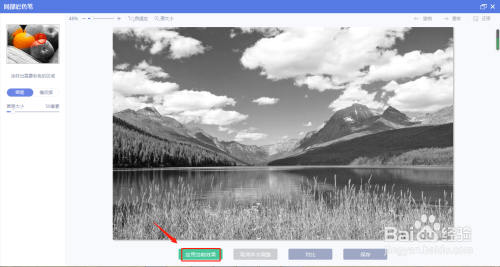 点击局部彩色笔进入局部彩色设置界面,此时照片主动切换当作口角模式,不需进行任何操作,直接选择下方的【应用当前结果】。