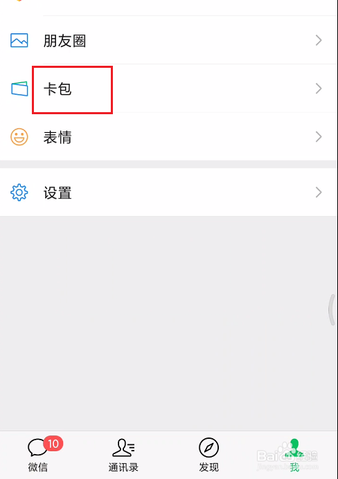 打开微信应用,打开卡包选项。