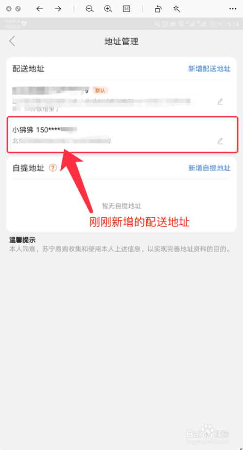 在【地址办理】列表中,就可以看到方才新增的配送地址了,如图所示。