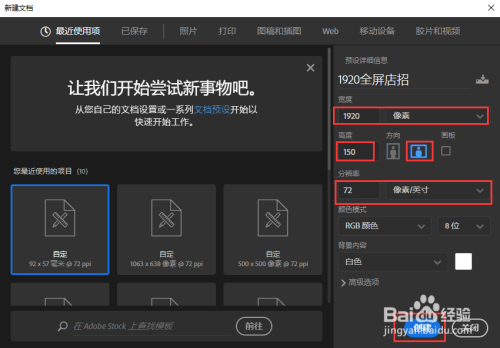 我们【新建】一个【1920*150像素】的白色画布,定名为:1920全屏店招,偏向选择为【横标的目的】,分辩率默认为【72】,点击【建立】按钮。