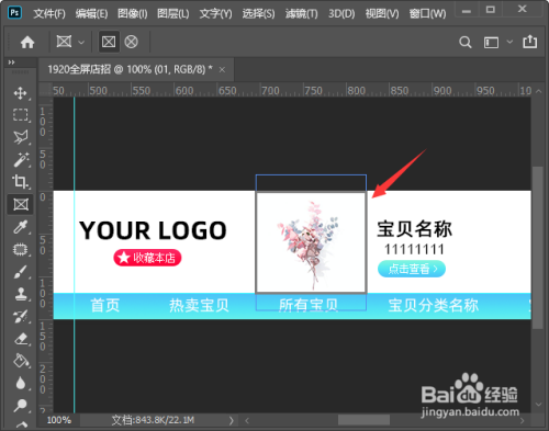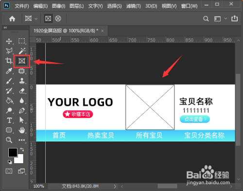 接下来,我们在白色布景上面输入LOGO文字或插入LOGO图片。在LOGO的右边先输入一组宝物名称,然后在保藏本店和点击查看的文字下面,别离画出圆角矩形作为点缀,如图所示。