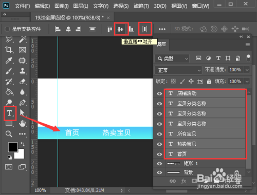 我们用【文字东西】输入导航条的文字,然后在图层中把文字全数选中,设置为【程度分布】和【垂直居中对齐】,如图所示。
