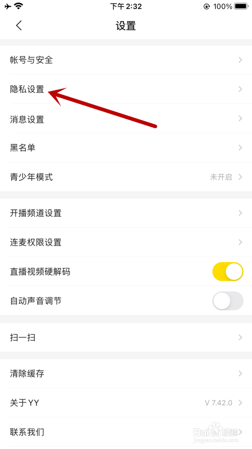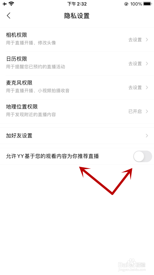 跳转新页面后,查找并点击“许可YY基于您的不雅看内容为您保举直播”右侧按钮。