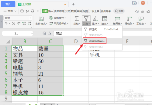 在起头界面,点击“筛选”,再点击“高级筛选”。