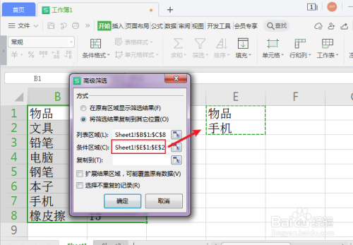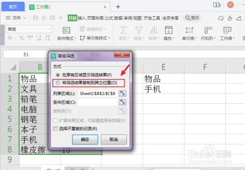 在“复制到”选择任一单位格,再点击“确定”看成筛选后的成果单位格。